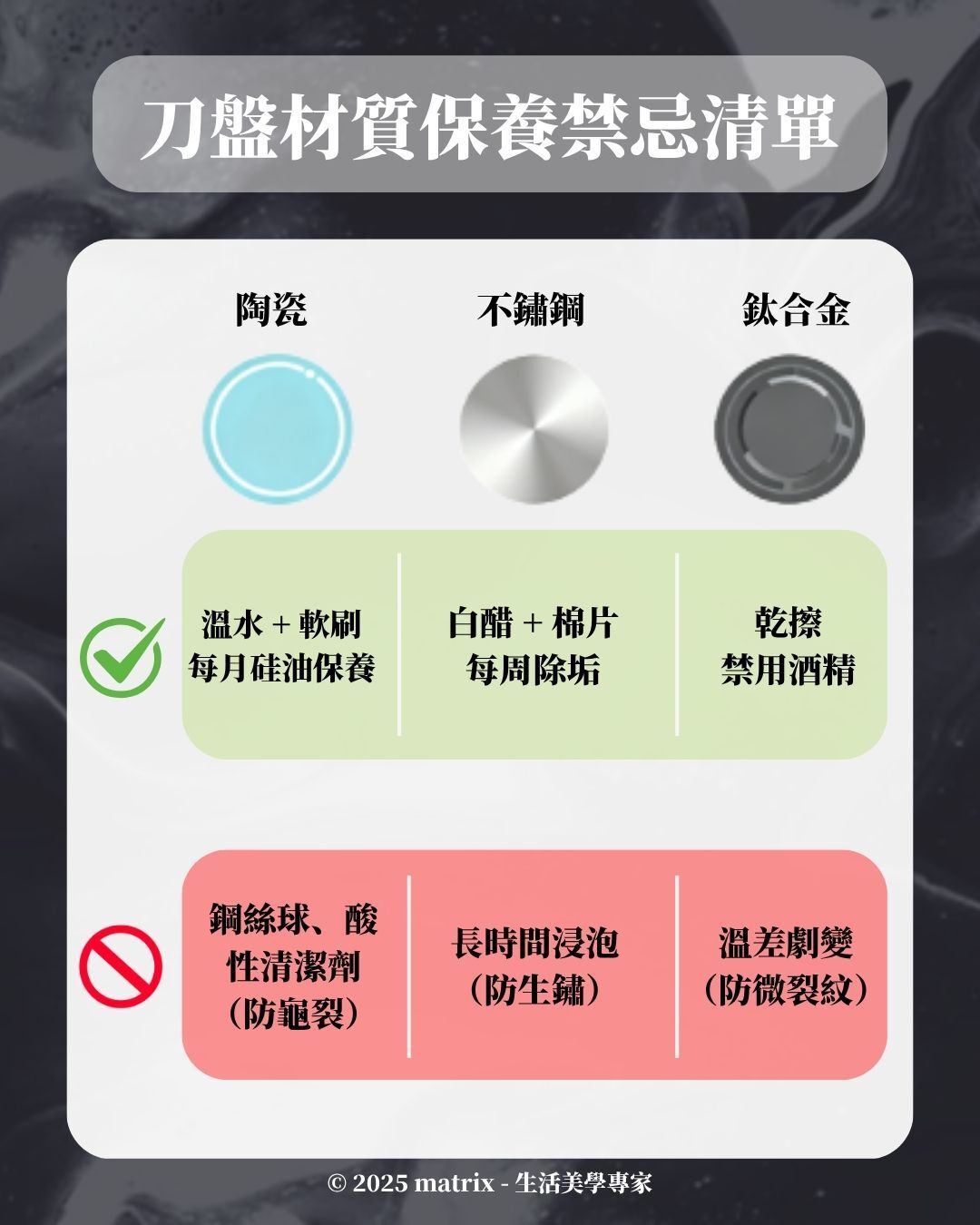不建議直接用水沖洗,容易造成生鏽或損傷刀盤。陶瓷刀盤可用溫水與軟毛刷清洗,不鏽鋼刀盤則可用濕棉片擦拭油垢,清潔後徹底晾乾,避免水分殘留。