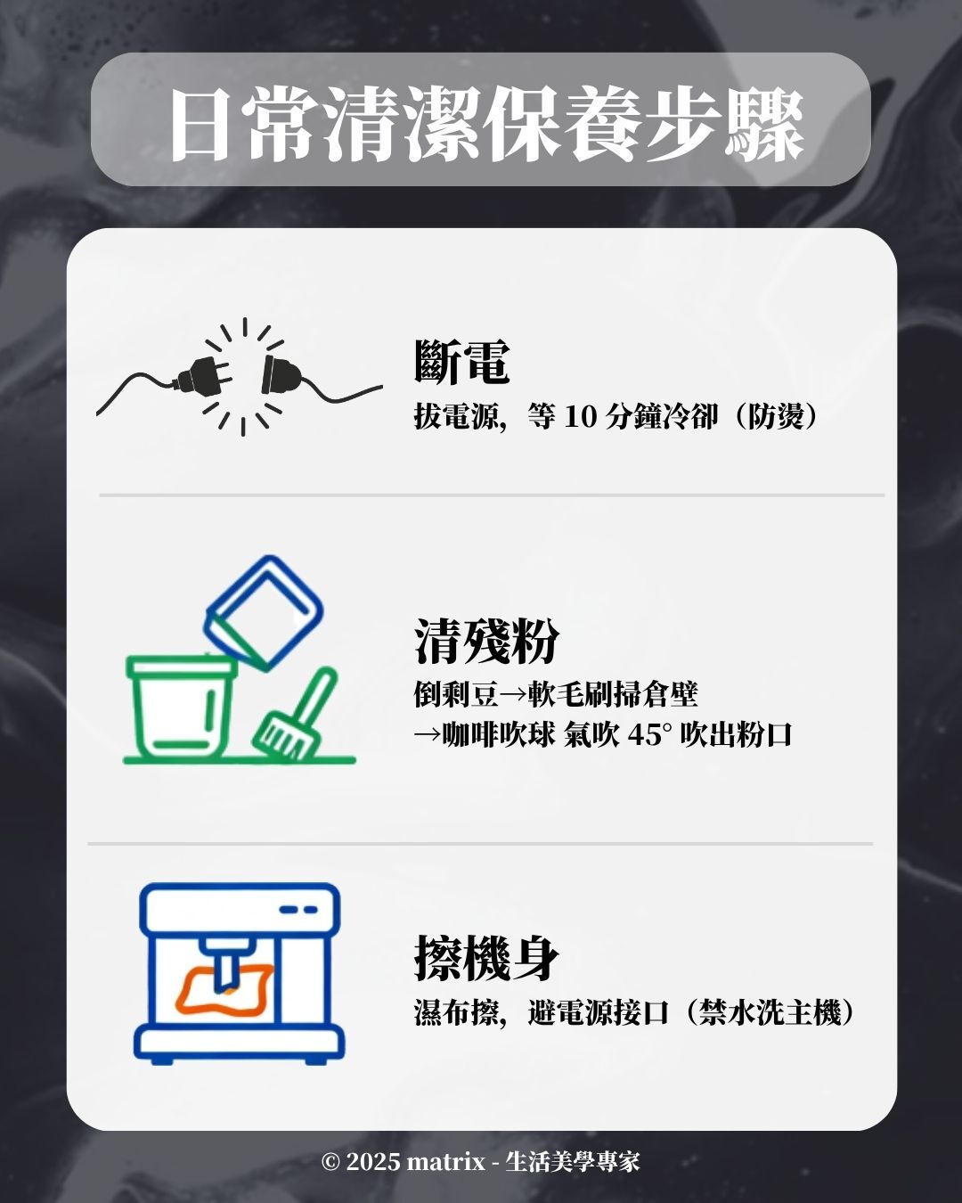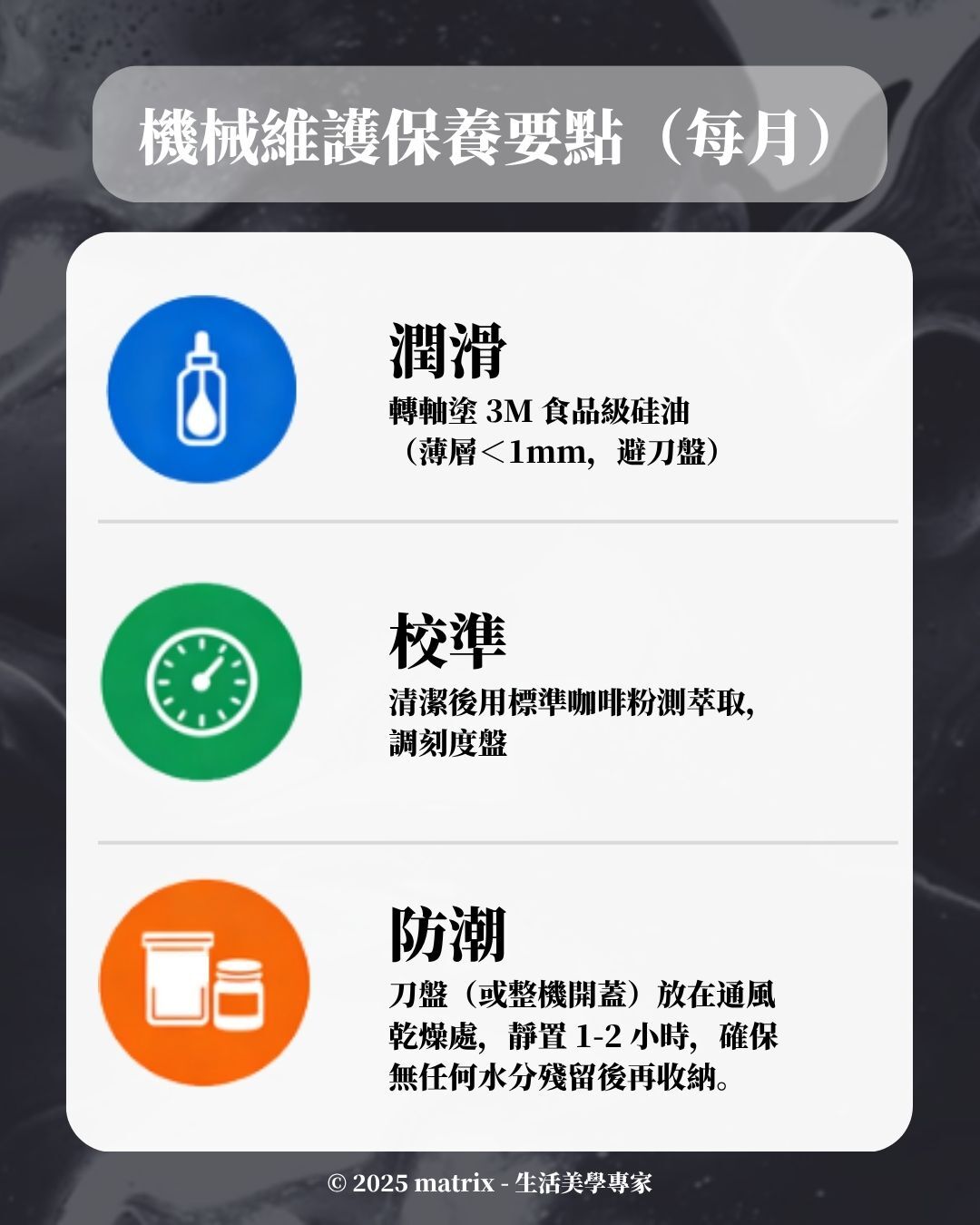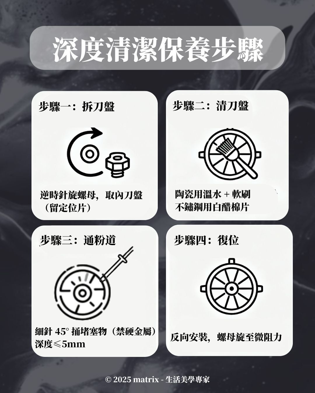 家用建議每 1-2 週清潔一次,商用則每日清理。清潔時包括粉槽、出粉口以及刀盤周邊。若磨豆機長時間未使用,也建議使用氣吹或毛刷清理積粉,以避免油脂氧化造成異味或磨盤阻塞。
