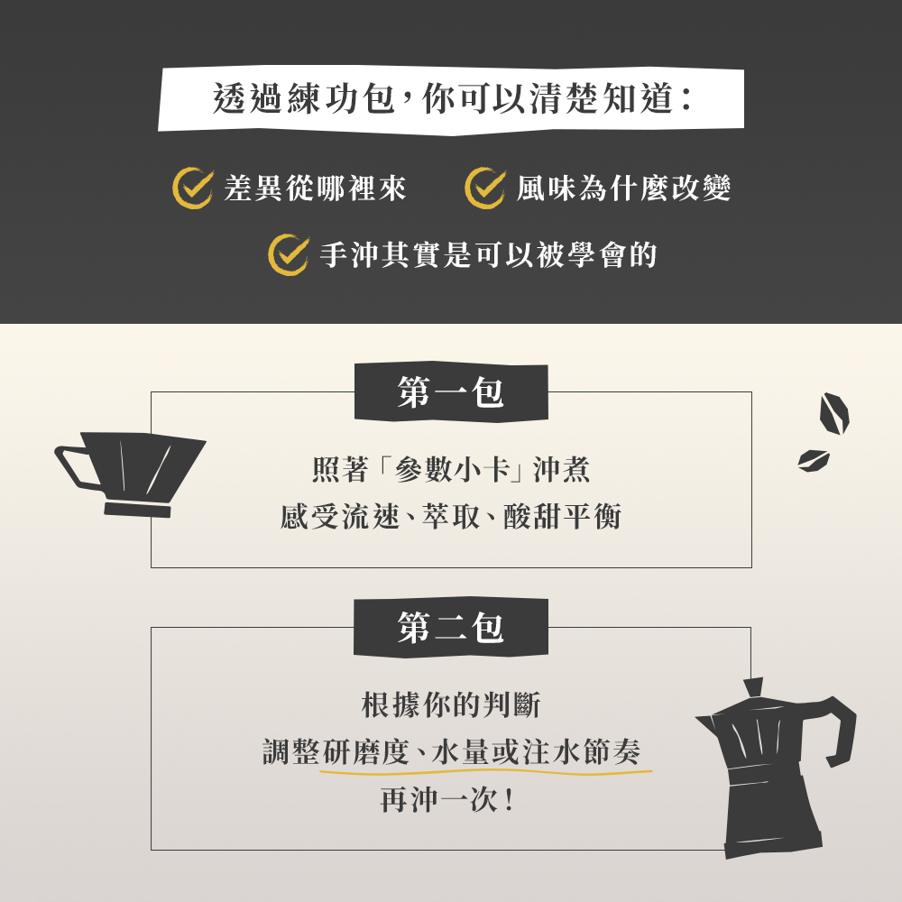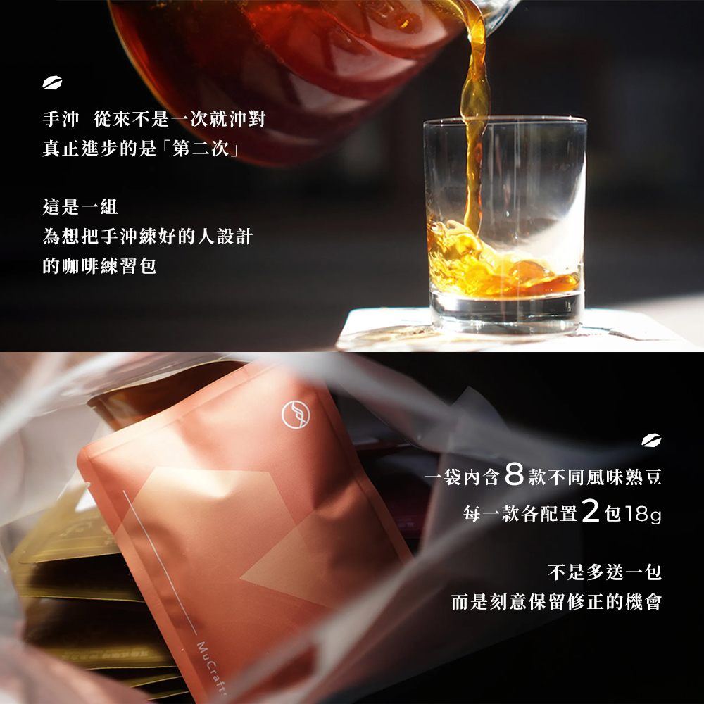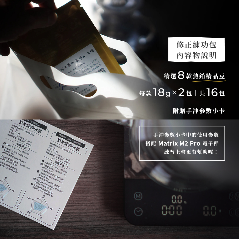 8款風味熟豆 x 16次練習,內附沖煮小卡搭配M2 PRO AI咖啡秤一起使用